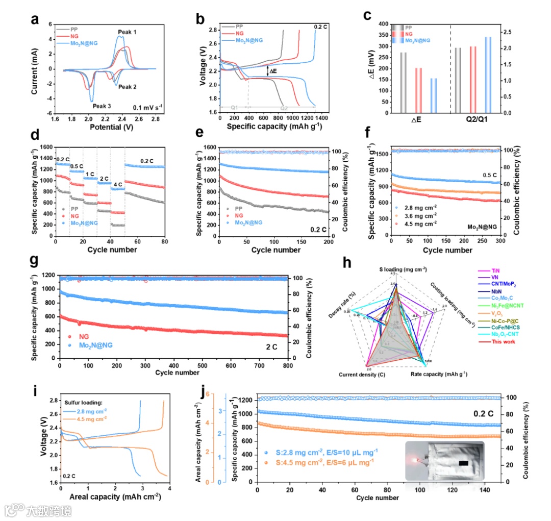 图4. a) 扫描速率为0.1 mV s-1的CV曲线。b) 电流密度为0.2 C时的恒电流充放电曲线。c)由充放电曲线计算得出的ΔE和Q2/Q1。d) 电池在0.2-4 C范围内不同电流密度下的倍率性能。e) 电池在0.2 C下的循环性能。f) Mo2N@NG/PP电池在高硫负载下的循环性能。g) 电池在2 C下的长循环稳定性。h) 与其他已发表的工作的比较。Mo2N@NG/PP隔膜的软包电池的i) 充放电曲线和j) 在高硫负载下的循环性能。