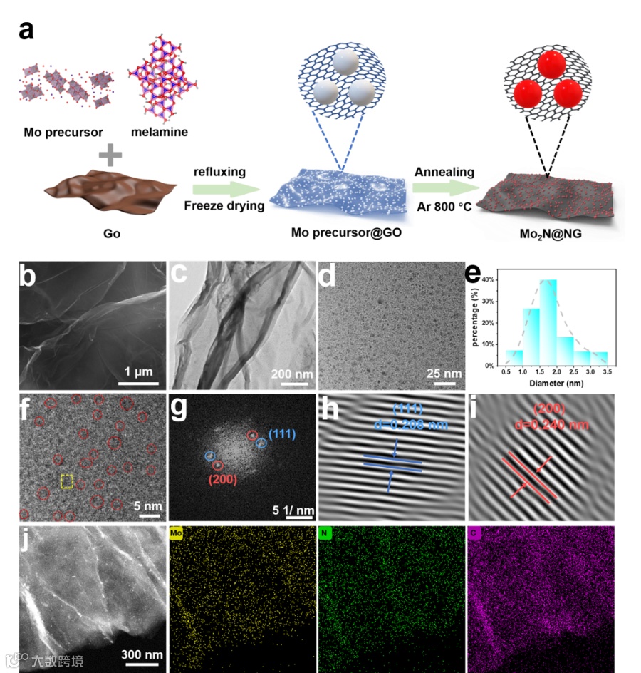 图1b-c显示Mo2N@NG超薄纳米片形貌,图1d显示Mo2N量子点均匀分布在NG表面,有利于构建多孔导电通道,保证电子快速转移。图1e-f表明Mo2N量子点的尺寸约为0.5-2 nm。图1g-i也验证了Mo2N的存在。图1j表明Mo2N@NG中Mo、N和C元素分布非常均匀。