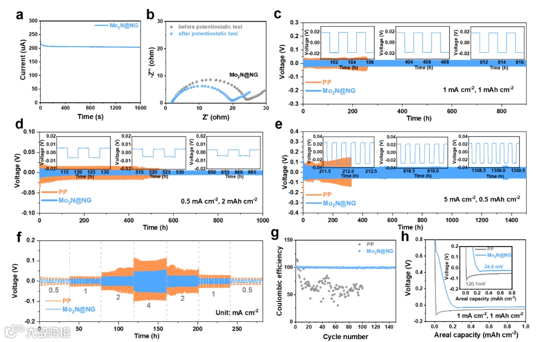 图3. PP隔膜和Mo2N@NG/PP改性隔膜的锂金属电池的电化学性能。a) i-t曲线和 b) 相应EIS图谱。Li||Li对称电池电压曲线:c) 在1 mA cm-2下,剥离/沉积容量为1 mAh cm-2,d)在0.5 mA cm-2下,剥离/沉积容量为2 mAh cm-2,和e) 在5 mA cm-2下,剥离/沉积容量为0.5 mAh cm-2。f) 在0.5 mAh cm-2的下的倍率性能。g) Li||Cu电池在1 mA cm-2和1 mAh cm-2的库仑效率。h) 首圈循环中剥离/沉积过程的电压曲线。