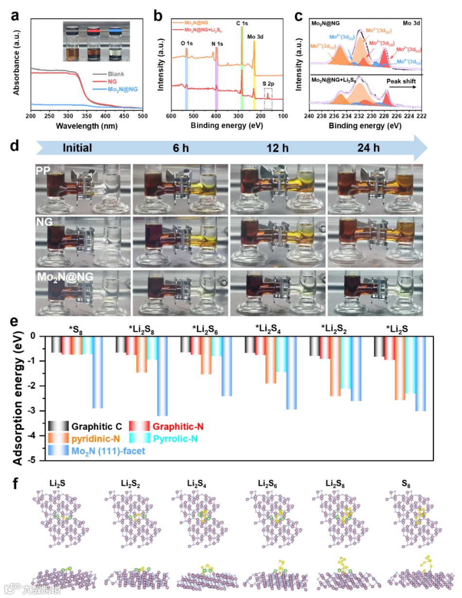 图5. a) 样品上吸附Li2S6后的紫外-可见吸收光谱。Mo2N@NG吸附Li2S6前后的b) XPS全谱和c) Mo 3d XPS谱图。d) 原始PP、NG/PP和Mo2N@NG/PP隔膜的Li2S6渗透测试。e) 吸附能的比较。f) S8/Li2Sn (n=1,2,4,6,8) 分子吸附在Mo2N (111)表面的原子结构。