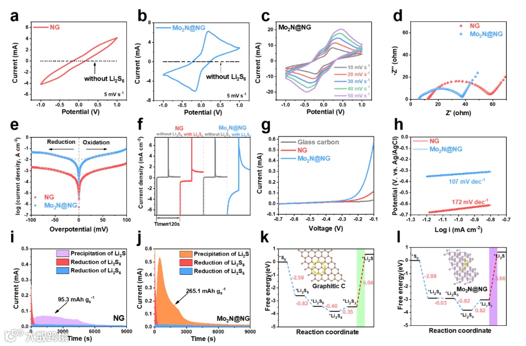 Mo2N@NG电极在与NG相比,显示出电极表面快速的动力学转化率。Li2S6对称电池的计时电流曲线表明锂化-脱锂反应过程中的电流响应而不是双层电容(图6f)。图6g显示Mo2N@NG电极的起始电压最低(-3.15 V),优于NG(-2.42 V),反映了其在不溶性Li2S到可溶性LiPSs的过程中具有更小能量势垒,可以有效地提高多硫化物的转化率。图6h表明,Mo2N@N电极具有较小的Tafel斜率(107 mV dec-1)。