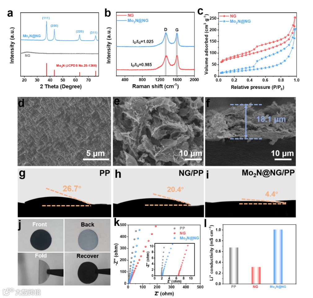 图2. NG和Mo2N@NG的a) XRD,b) 拉曼光谱,和c) BET曲线。d) 原始PP和e) Mo2N@NG/PP改性隔膜表面的SEM图像。f) Mo2N@NG/PP改性隔膜的横截面SEM图像。g-i) PP、NG/PP和Mo2N@NG/PP隔膜的接触角测试。j) Mo2N@NG/PP改性隔膜在不同应力下的照片。PP、NG/PP和Mo2N@NG/PP改性隔膜的k) EIS和l) 的锂离子电导率。
