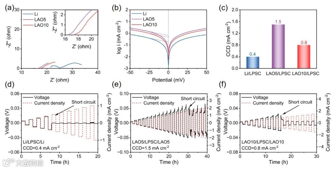 通过EIS和Tafel测试发现,与纯锂金属相比,LAO电极界面处Li+扩散动力学更高,其交换电流密度i0为0.68 mAcm-2。通过临界电流密度(CCD)测试,LAO电极临界电流密度为1.5 mA cm-2,而锂金属电极的临界电流密度仅为0.4 mA cm-2。