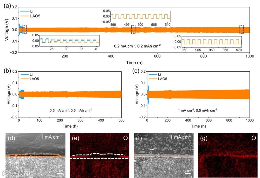 在不同电流密度(0.2, 0.5和1 mA cm-2)和循环容量(0.2和0.5 mAh cm-2)的测试条件下,LAO电极对称电池均能保持良好的稳定性。通过Li/SSE和LAO/SSE界面的截面SEM图像研究了循环后界面接触,在Li/SSE界面上能明显发现空隙的形成。相比之下,LAO/SSE界面接触紧密,没有空隙和锂枝晶的形成。以上结果表明,通过提高锂金属体相锂扩散动力学可以有效缓解界面空隙的形成。