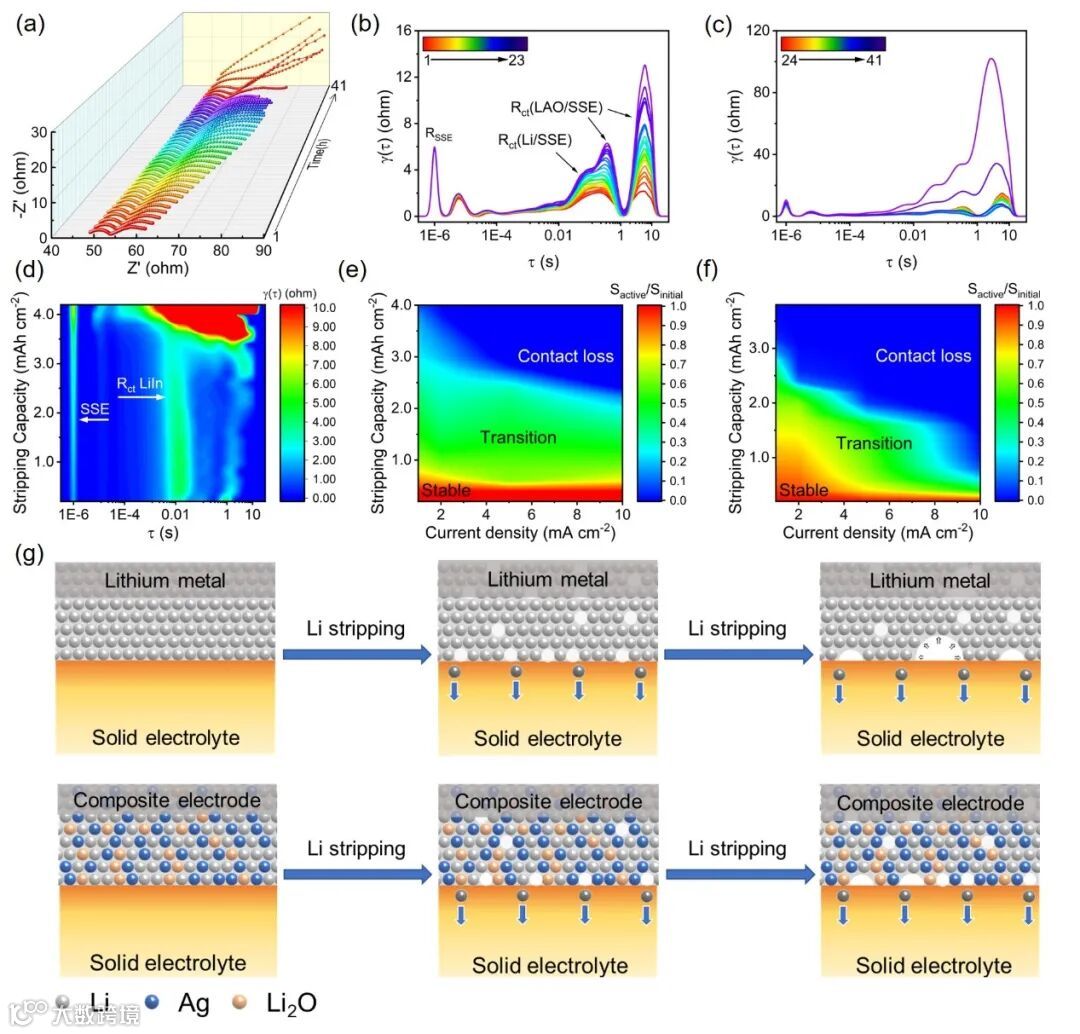 为了研究锂剥离过程中LAO/SSE界面演变过程,进行了原位电化学阻抗(GEIS)和弛豫时间分布(DRT)分析。在不同电流密度(1, 2, 5和10 mA cm-2)下,LAO阳极均可以比锂金属负极提供更多的容量,这是因为LAO阳极中锂原子/离子可以通过部分脱锂的Li-Ag合金和Li2O从电极体相转移到界面处,而在锂金属负极中锂原子无法通过空隙传输。