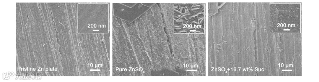 水系电解液会与金属锌发生副反应,导致电池的容量下降以及寿命衰减。如图3所示,锌片在硫酸锌电解液中浸泡8天后,其表面生长一层纳米片。相比较之下,浸泡在添加蔗糖的硫酸锌电解液中的锌片表面仍然平滑;充分说明蔗糖分子在锌负极表面形成一层保护层,避免了水分子对锌片的腐蚀。