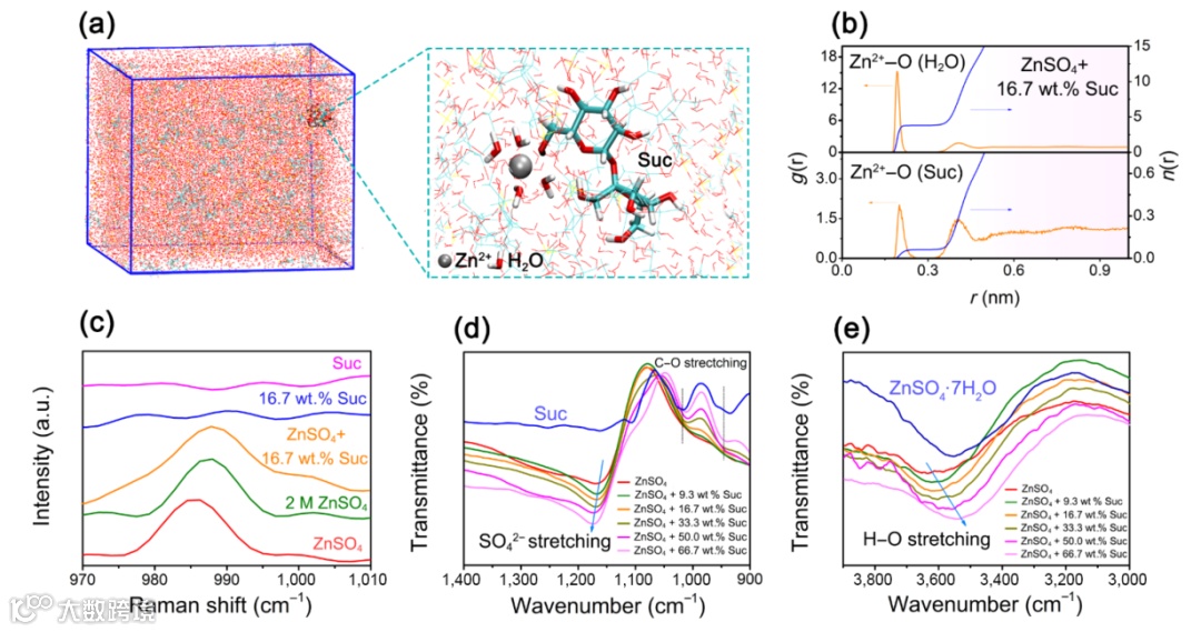 在水系硫酸锌电解液中,锌离子的溶剂化结构为Zn(H2O)62+。当引入多羟基的蔗糖到电解液中,MD计算结果表明锌离子的溶剂化结构发生了变化,由Zn(H2O)62+转变成Zn(C12H22O11)(H2O)x 2+。拉曼光谱、红外光谱结果证明蔗糖分子的确进入到锌离子的溶剂鞘层中。这些蔗糖分子改性后的锌离子电解液表现出较宽的电化学窗口以及较高的锌离子迁移数。