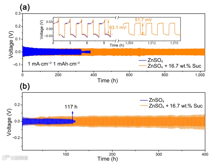 对称Zn/Zn电池以及Zn/Cu电池测试结果表明,蔗糖的添加的确有效抑制了锌枝晶的产生,延长了锌负极的寿命。究其原因,一方面是蔗糖分子在锌负极表面形成一层保护层,避免了电解液的直接接触;另一方面蔗糖分子进入到锌离子溶剂结构提升了锌离子的输运速率,减小了锌离子在锌负极表面的浓差极化,进而抑制了枝晶的生长。