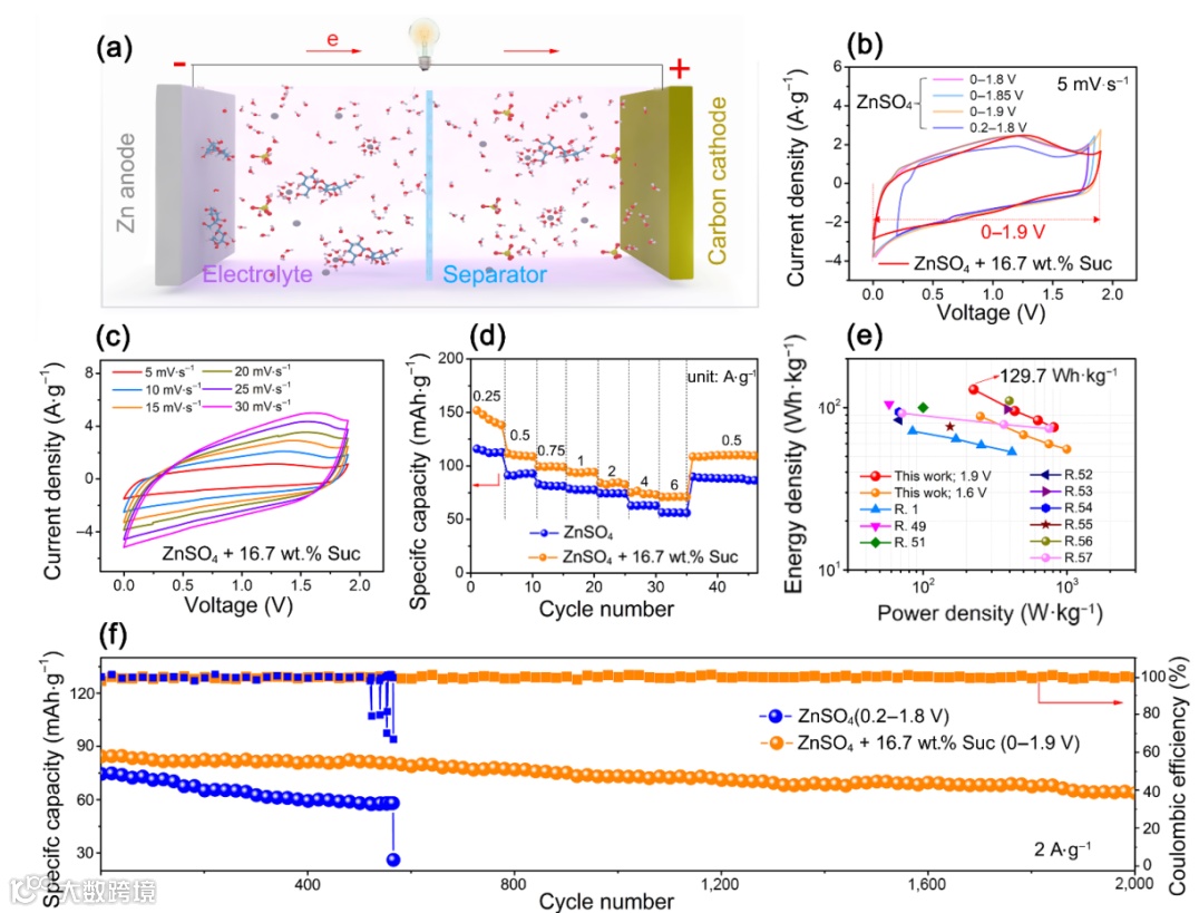 基于蔗糖改性的水系电解液应用到Zn/C电池中,表现出较好的性能。如图4所示,相比于水系电解液的电压窗口为1.6V,引入蔗糖后的电压窗口可拓展到1.9V。电池的倍率性能也很好表明蔗糖修饰的电解液锌离子的动力学更快,倍率特性更好。长循环测试结果表明,蔗糖电解液可稳定循环到2000圈,远远长于水系电解液。
