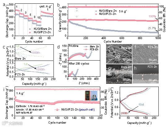 图5. NH4V4O10//Zn电池的电化学性能:a) 倍率性能;5 A g-1条件下的b) 循环性能和c) 充放电曲线;d) 电池的初始阻抗和200次循环后的阻抗;e-h) 循环后极片的SEM图像;1 A g-1条件下NH4V4O10//PZS-Zn软包电池的i) 循环性能。插图显示了组装软包电池的起始电位,以及j) 充放电曲线。