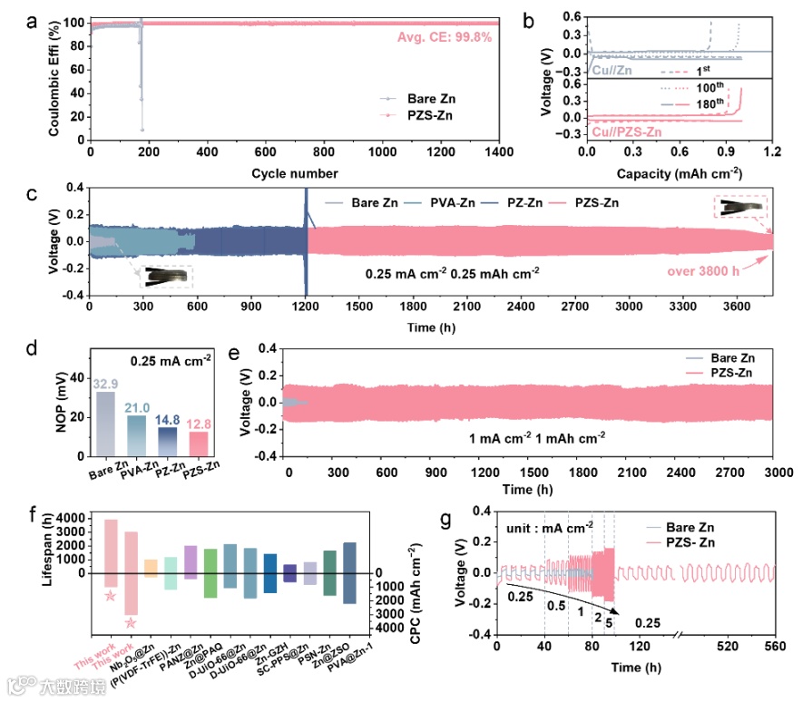 图2. 电化学可逆性分析:Cu//Zn电池的a) 循环性能,以及b) 电压/容量曲线;不同负极在c) 0.25 mA cm-2、0.25 mA h cm-2和e) 1 mA cm-2、1 mA h cm-2条件下的恒流长循环性能;d) 锌形核过电位对比;f) PZS-Zn电极与其他报道的保护层的累计容量和电流密度性能对比;g) 对称电池的倍率性能对比。