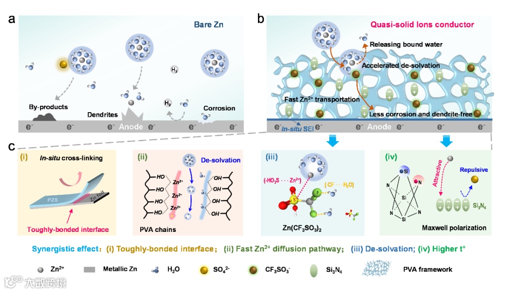 示意图. 锌在a)裸锌、b)PZS-Zn电极上的沉积行为示意图;c)制备的PZS中间相的协同作用示意图。