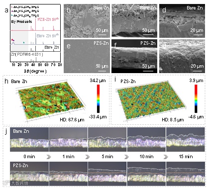 图3. 表面形貌和结构演变分析:a) 裸锌、PZS-Zn负极循环前后的Zn负极的XRD图;b-d) 裸锌、e-g) PZS-Zn负极(剥离PZS层)在1 mA cm-2、1 mA h cm-2条件下循环50次后的SEM图像,以及h-i) 相应的3D高度图像;j) 裸锌、PZS-Zn电极上Zn沉积的原位光学显微图像。