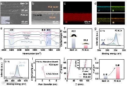 图1. 结构表征:a) 裸锌、PZS-Zn电极的表面SEM图像;b) PZS-Zn电极的截面SEM图像和c-d) 相应的EDS元素分布图;e) PVA、Zn(CF3SO3)2,Si3N4粉末、PZ和PZS层的FTIR谱;f) 裸锌、PZS-Zn电极与硫酸锌电解液之间的接触角;g) PZS-Zn电极的C 1s XPS光谱;h) 从PZS-Zn电极上剥离PZS层得到的Zn表面的O 1s XPS光谱;i) PZS层的孔径分布图;j) PZS层的离子电导率;k) 裸锌和PZS-Zn负极体系的Zn2+迁移数。