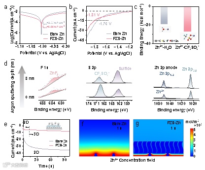 图4. PZS层的作用机理分析:a) Tafel 曲线;b) HER性能;c) Zn2+-H2O, Zn2+-CF3SO3-的结合能计算;d) 循环后PZS-Zn电极表面(剥离PZS层)的XPS图谱;e) CA曲线;分别为f) 裸锌、g) PZS涂层的Zn负极表面模拟的离子浓度分布。