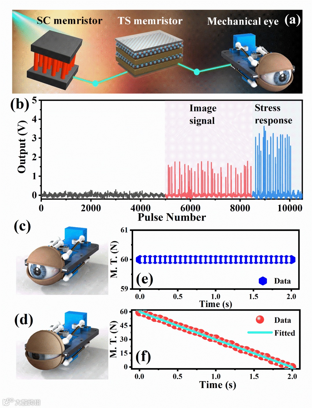 作者团队设计了一个模拟人类视觉系统三种功能的人工视觉系统:感知、记忆和保护行为。SC纳米棒阵列光电忆阻器接收光信号并将其转换为电压,然后将其传输至基于阈值开关忆阻器的神经元电路。当神经元电路的输出电压达到设定值时,机械眼被激活以完成运动。Sb2Se3/CdS的设计使SC器件能够执行光学突触的基本功能,同时显著提高光收集率。