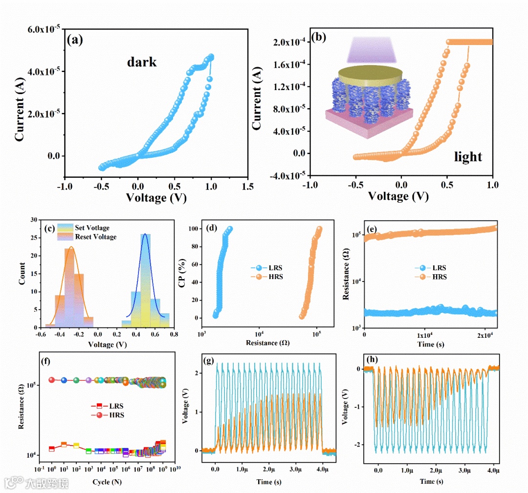 图2:。SC器件的电气性能表征。a) SC纳米棒阵列器件在黑暗中的I-V特性。b) SC纳米棒阵列光器件的I-V特性。c) SC纳米棒阵列器件在光照下的设定电压和复位电压的分布,曲线为高斯分布,符合直方图。d)在光照下扫描100个I-V周期的电阻分布统计。e)纳米棒阵列器件在光照下的保留特性。f) 在光照下测量了SC纳米棒阵列器件的脉冲耐久性。g) 连续20个正脉冲后的电压响应。h) 连续20个正脉冲后的电压响应。