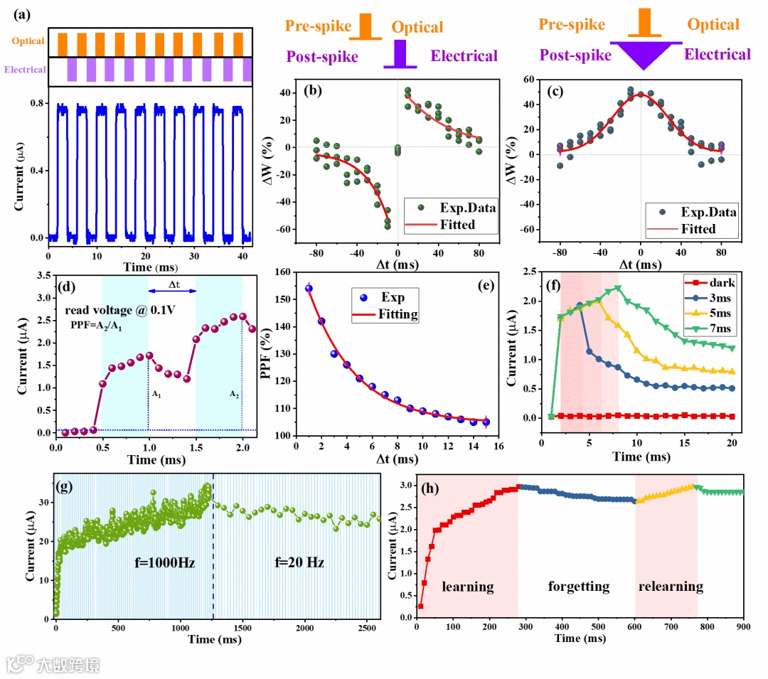 图3:光可调突触特性。a) SC器件的脉冲开关特性。b) SC器件模拟时间依赖性可塑性(STDP)功能。c) SC器件模拟对称STDP功能。d) 由两个相隔1秒的连续光脉冲引起的突触后电流。e) 配对脉冲易化指数(A2/A1)与两个光脉冲之间的时间间隔之间的关系。f) 波长为650 nm的光-时间依赖性(0、3 ms、5 ms、7 ms)短期塑性。g) 电导对一系列频率变化的光脉冲的响应。h) 模拟生物学习过程。