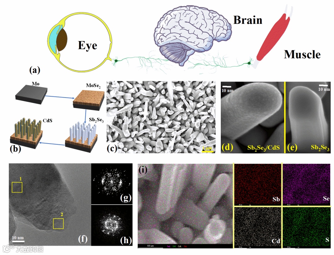 图1:Sb2Se3纳米棒阵列的结构表征。a) 生物视觉系统示意图。b) 用CdS沉积Sb2Se3(SC)纳米棒阵列忆阻器的步骤。c) Sb2Se3纳米棒阵列的扫描电子显微镜(SEM)顶视图显微照片。d) 一个SC核/壳纳米棒的SEM图像。e) 一个Sb2Se3核心纳米棒的SEM图像。f) SC纳米棒的高分辨率TEM图像。i)Sb2Se3/CdS纳米棒的SEM图像和EDS元素图。