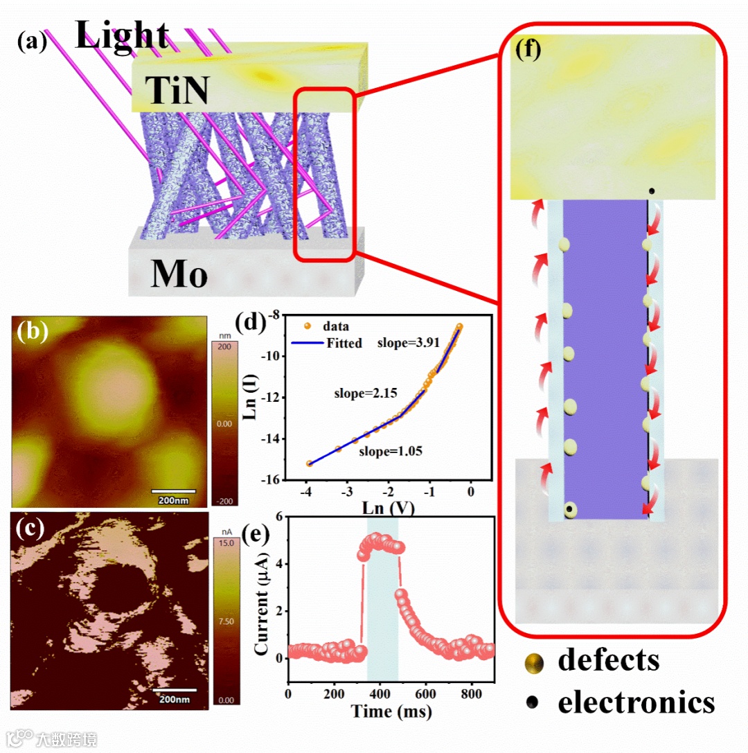 图4:。SC忆阻器的物理机制。a) SC纳米棒阵列装置中的光吸收和反射示意图。b) TiN/SC/Mo装置的Ln(I)-Ln(V)曲线。c) 蓝光下,典型的异质结电流发展过程。d–e)SC纳米棒阵列表面AFM的表面形貌和c-AFM的电流分布。f) SC纳米棒阵列装置的工作机理示意图。