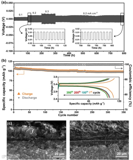 要点四: 三方相NASICON表现出良好的倍率性能,在0.1、0.2、0.3 mA cm-2可稳定循环100 h,具有良好抑制枝晶生长的能力。350 h循环后Na负极与NZSSP-1150电解质仍保持紧密接触,并有一薄层钠化界面层,表明NZSSP-1150与Na之间具有良好界面特性。