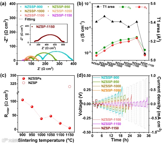 图2. (a) 30 oC时Na/NZSSP/Na对称电池的EIS;(b) NASICON的σb、σt、T1瓶颈面积;(c) 界面电阻;(d) CCD测试