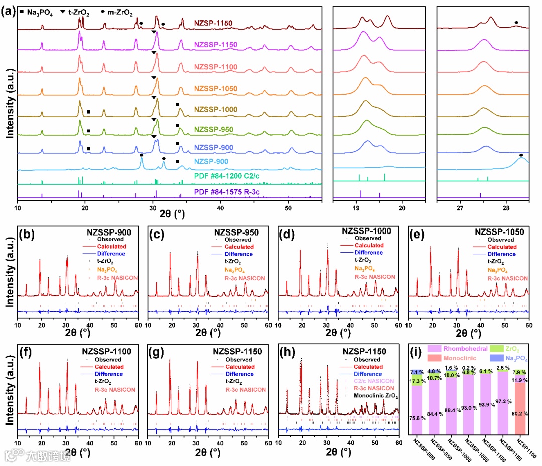 图1. (a)在900-1150 oC下烧结的NZSSP和NZSP的 XRD,(b-h) Rietveld精修结果,(i) 样品晶相组成