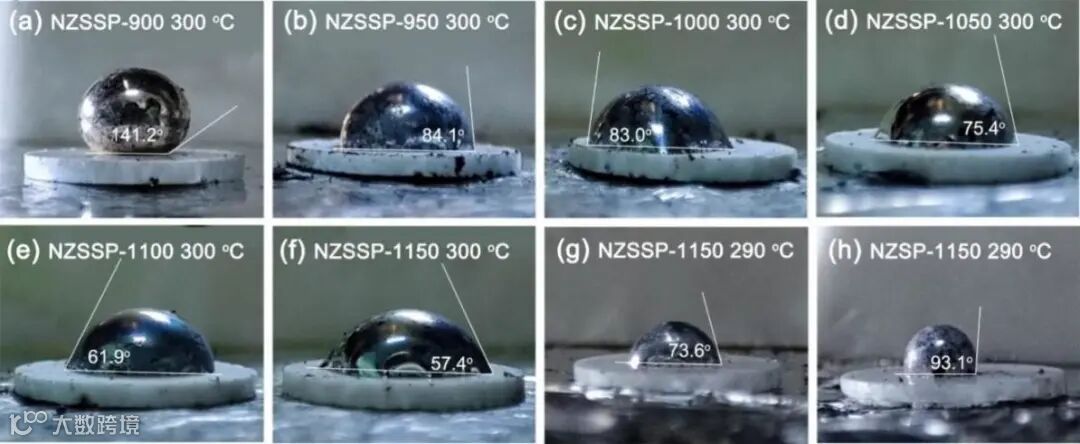 图3. (a-f) Na在300 oC时与NZSSPs的润湿情况;(g) NZSSP-1150 和 (h) NZSP-1150在290oC时与Na的润湿情况