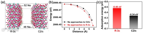 图4. (a) 100个自由Na原子在三方相和单斜相表面上的分布;(b) Na层在由两块不同晶相层构建的空腔内的能量随位置的变化;(c) 单个Na原子在不同晶相表面上的吸附能
