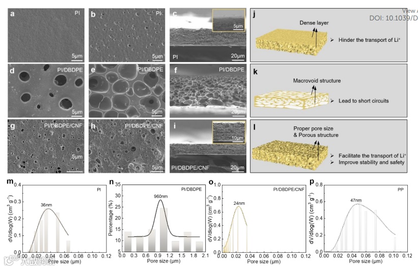 图2. PI、PI/DBDPE和PI/DBDPE/CNF的结构表征。(a)-(c) PI膜的上侧(空气侧)、底侧(玻璃侧)和横截面的SEM图像。(d)-(f) PI/DBDPE的上侧、底侧和横截面的SEM图像。(g)-(i) PI/DBDPE/CNF的SEM图像。(j)-(l) 具有不同孔隙结构的三种隔膜。适当的孔隙尺寸有助于Li+的传输,提高电池的稳定性和安全性。(m)-(p) PI、PI/DBDPE、PI/DBDPE/CNF和PP隔膜的孔隙尺寸分布。PI/DBDPE/CNF隔膜表现出小的孔隙尺寸和均匀的孔隙尺寸分布,表明添加DBDPE可以显著改善孔隙结构。