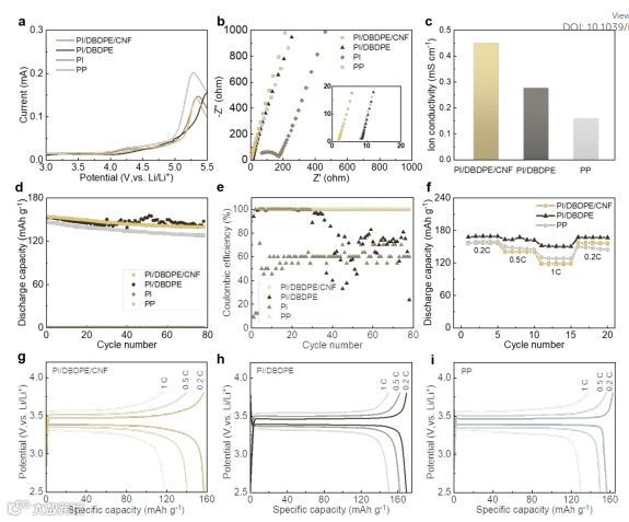 图4. 使用PI/DBDPE/CNF、PI/DBDPE、PI和PP隔膜组装的电池在室温下的电化学性能。(a) 线性扫描伏安(LSV)曲线和(b) Nyquist图。(c) 离子导电率。(d) PI/DBDPE/CNF、PI/DBDPE、PI和PP电池在0.5 C下的放电容量和(e) 库伦效率。(f) PI/DBDPE/CNF、PI/DBDPE和PP电池的倍率性能。(g) 使用PI/DBDPE/CNF、(h) PI/DBDPE和(i) PP隔膜组装的电池的电压曲线。在三种PI基隔膜中,使用PI/DBDPE/CNF组装的电池表现出与PP相似的优异电化学性能。