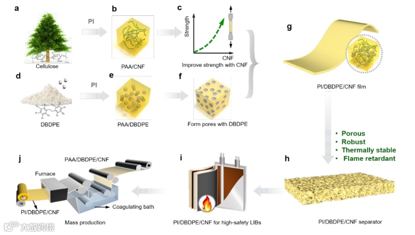 图1. PI/DBDPE/CNF复合隔膜的设计及其在LIBs中的应用。(a) 用于制备CNF的天然木材原料。(b) PI/CNF复合材料。(c) CNF的添加可以增强PI隔膜的机械性能。(d) DBDPE粉末的数字照片。(e) PI/DBDPE复合材料。(f) DBDPE的添加可以促进PI隔膜内部的孔隙形成。(g) PI/DBDPE/CNF混合隔膜。(h) PI/DBDPE/CNF的孔隙结构示意图。(i) PI/DBDPE/CNF复合隔膜在LIBs中的应用,可以提高电池的热稳定性和安全性。(j) PI/DBDPE/CNF的大规模生产示意图。