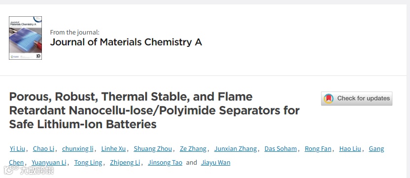 上海交通大学万佳雨副教授&华南理工大学陶劲松副教授团队在国际知名期刊Journal of Materials Chemistry A发表题为“Porous, Robust, Thermal Stable, and Flame Retardant Nanocellu-lose/Polyimide Separators for Safe Lithium-Ion Batteries”的研究论文。将十溴二苯乙烷(DBDPE)和纤维素纳米纤维(CNF)引入到PI中,制备出具有出色的孔结构和优异的机械性能的复合隔膜。在 DBDPE 的辅助下,隔膜获得了精确且分布均匀的孔径 (20 nm),同时通过相转化过程表现出高孔隙率 (78%)。由于CNF的引入,隔膜的机械性能显着提高,拉伸强度为25.4 MPa,弹性模量为550.1 MPa。此外,该隔膜还具有高离子电导率(0.45 mS cm-1)、优异的热尺寸稳定性(高达200 °C)、显著的阻燃性和出色的电解质润湿性。在室温下,使用该隔膜的电池表现出与聚丙烯 (PP) 隔膜相当的性能。当进行热冲击处理时,使用该隔膜的电池的性能明显优于PP的电池,显示出其优越的性能。这项工作提出了一种设计高性能分离器的新颖策略,从而为具有增强安全特性的锂离子电池的制造进步铺平了道路。