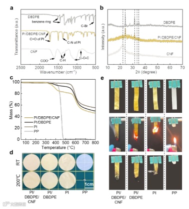 图3. PI/DBDPE/CNF、PI/DBDPE、PI和PP的化学结构和热性能。(a) DBDPE、CNF和PI/DBDPE/CNF隔膜的傅里叶红外光谱和(b) X射线衍射图谱。(c) PI/DBDPE/CNF、PI/DBDPE、PI和PP的热重曲线。(d) 不同隔膜的热尺寸稳定性(200 °C,1小时)。(e) 隔膜的阻燃性测试。结果表明PI/DBDPE/CNF具有优异的热稳定性和阻燃性能。