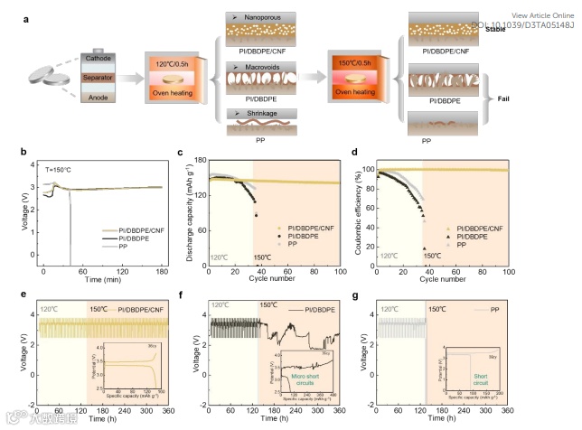 图5. 使用PI/DBDPE/CNF、PI/DBDPE、PI和PP隔膜组装的电池在高温冲击处理下的电化学性能。(a) 电池高温冲击处理测试的示意图。(b) 使用PI/DBDPE/CNF、PI/DBDPE和PP隔膜组装的电池在150 °C下的开路电压曲线。(c) 在120和150 °C的高温冲击处理后,PI/DBDPE/CNF、PI/DBDPE和PP电池在0.5 C下的放电容量和(d) 库伦效率。(e) 在高温冲击处理后,PI/DBDPE/CNF、(f) PI/DBDPE和(g) PP电池的电压-时间曲线,而(e-g)的插图是电池第36次循环的充放电曲线。使用PI/DBDPE/CNF隔膜组装的电池能够承受高温冲击处理。