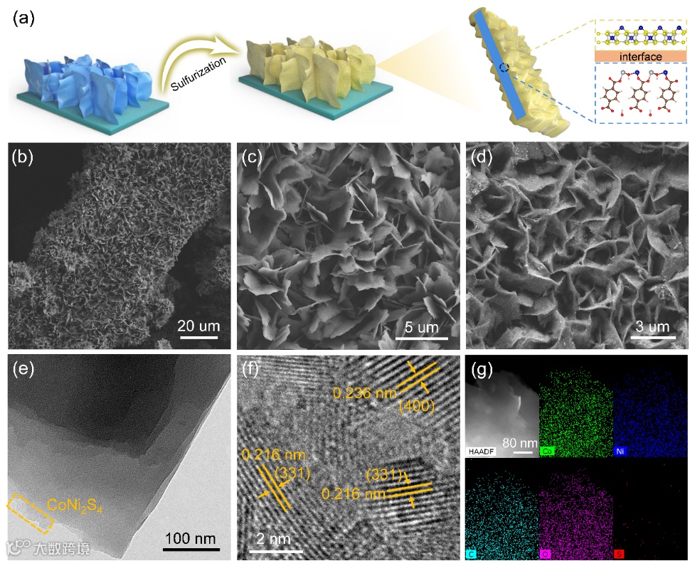 通过一步水热硫化的方式控制硫化反应时间在MOF表面原位生长一层硫化物形成了异质界面结构。