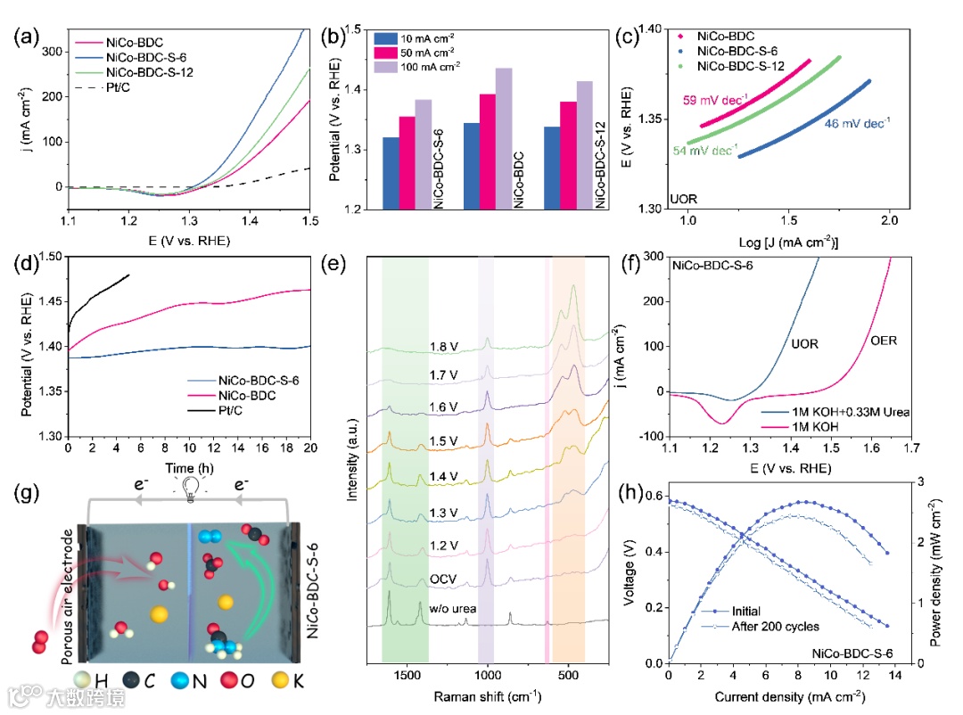 线性扫描伏安曲线表明最优样品NiCo-BDC-S-6仅需要1.326 V (vs. RHE)的驱动电势就能达到10 mA cm-2 的电流密度。图3d显示了商业Pt/C,NiCo-BDC和NiCo-BDC-S-6的计时电路曲线,结果表明部分硫化后MOF的催化稳定性得到提高,并且优于商业Pt/C催化剂。相比于析氧反应(OER),UOR的驱动电位要低很多,因此此催化剂可以通过驱动UOR取代OER完成水分解制氢,大幅降低制氢能耗。此外,当作为UOR催化剂用于尿素燃料电池时,此催化剂也表现除了优异的性能。