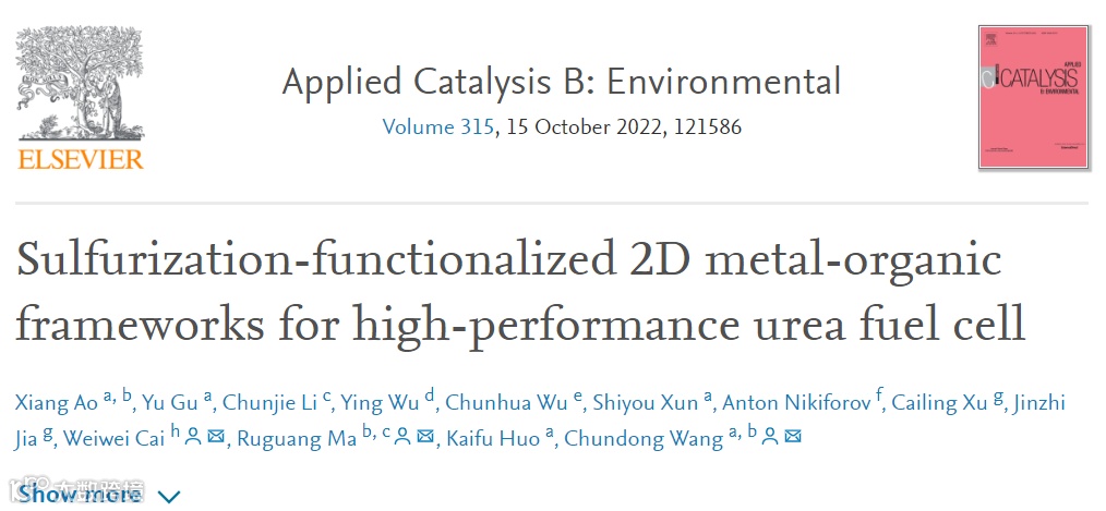 基于此,华中科技大学王春栋课题组在Applied Catalysis B: Environmental上发表题为“Sulfurization-Functionalized 2D Metal-Organic Frameworks for High-Performance Urea Fuel Cell”的研究文章。