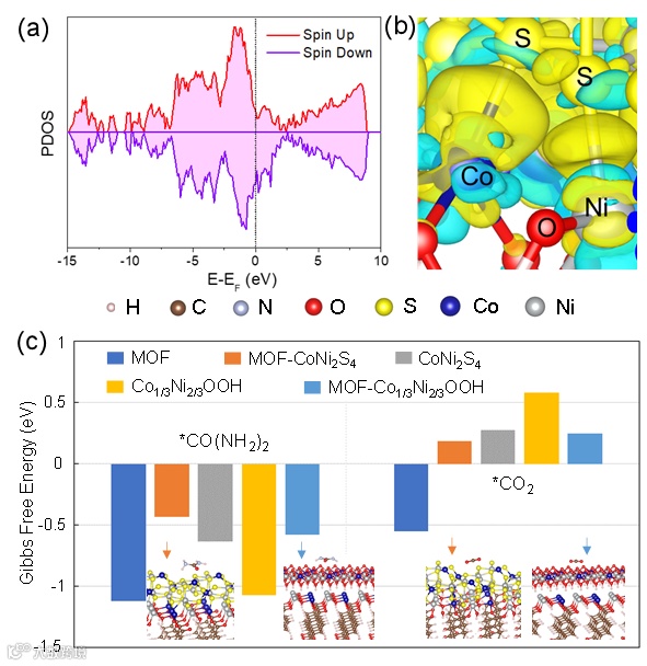 异质结界面的构造有效提升了催化剂的导电性,有利于电荷传输。差分电荷密度表明界面处发生了电子的再分配,证实了MOF与表面硫化物之间的相互作用。而催化剂对关键中间产物的吸附自由能揭示了异质界面协同系统的优越性。
