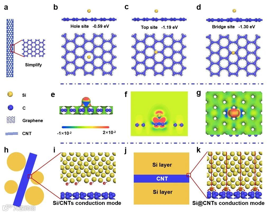 图3. 硅原子在碳纳米管表面沉积的DFT计算和面对面导电机制。