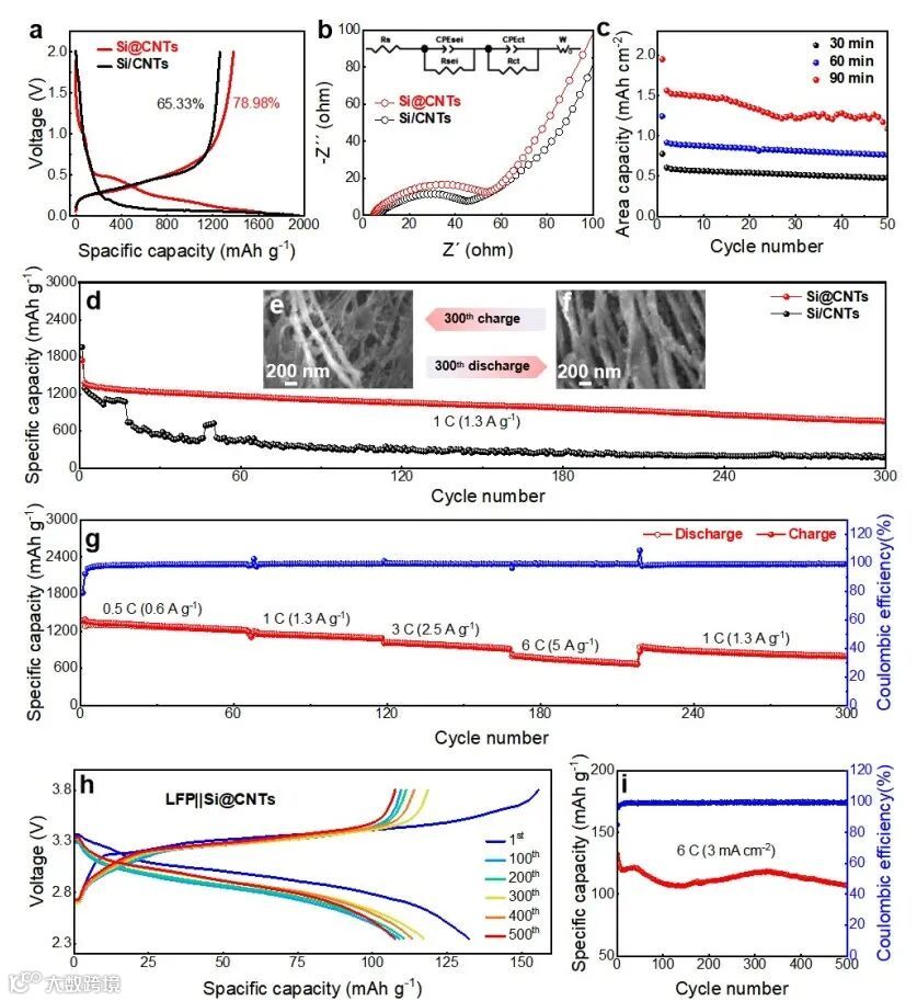 图5. Si@CNTs纤维膜的半电池和全电池性能。