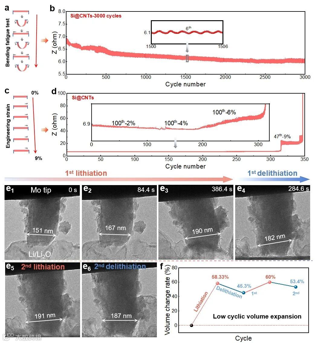 图4. Si@CNTs纤维膜的原位应力应变-导电性测试和原位TEM测试。