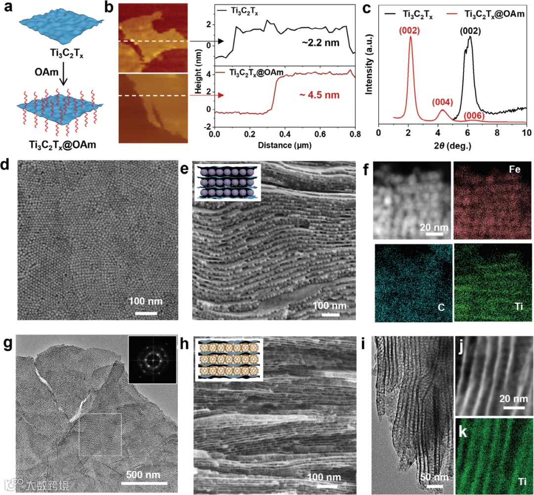 该研究通过自下而上的胶体组装策略,成功构筑了Ti3C2Tx/MMCFs叠层超晶格结构材料。利用长链有机配体修饰的二维纳米片和零维纳米晶的胶体共组装,研究团队实现了有序的二维/零维逐层堆叠超晶格。采用油胺(OAm)修饰的Ti3C2Tx纳米片和油酸(OA)修饰的Fe3O4纳米颗粒,通过表面配体密度的差异,促使它们实现逐层有序组装。随后通过配体碳化以及对Fe3O4的刻蚀,最终形成了Ti3C2Tx/MMCFs叠层超晶格结构。该超晶格具有三维有序的导电网络,释放了Ti3C2Tx纳米片的活性表面,扩大了纳米片层间间距,并在三维互联中提高了整体的传质性能和面外导电率。