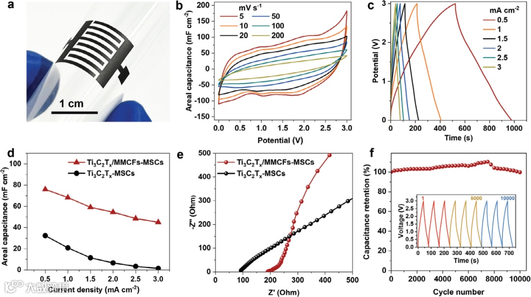 图3 Ti3C2Tx/MMCFs叠层超晶格微型超级电容器器件的测试