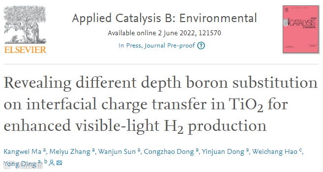 自从1972年Honda和Fujishima报道了基于TiO2在光催化方面的开创性工作之后,二氧化钛(TiO2)已成为一种明星半导体,并以其无毒、廉价、安全等优点不断受到人们的广泛关注。然而, 由于TiO2的带隙较大(锐钛矿相3.2 eV,金红石相3.0 eV),导致其只能吸收紫外光,且其光生载流子易复合,转移动力学缓慢,这些严重限制了其在光催化反应中的应用。非金属原子掺杂(如C、N、P和B)是提高TiO2可见光捕获能力的一种有效的方法,这种策略所带来的局部结构变化会大大影响到TiO2的光吸收能力以及光生载流子的动态转移过程。不同深度上的B掺杂位点如何具体地诱导和改善光生载流子的迁移和分离动力学行为亟需被探讨。