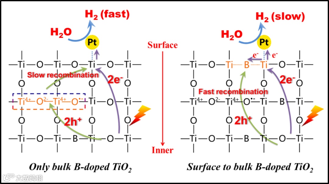 图1. 不同深度B掺杂TiO2样品的电子转移机理示意图。