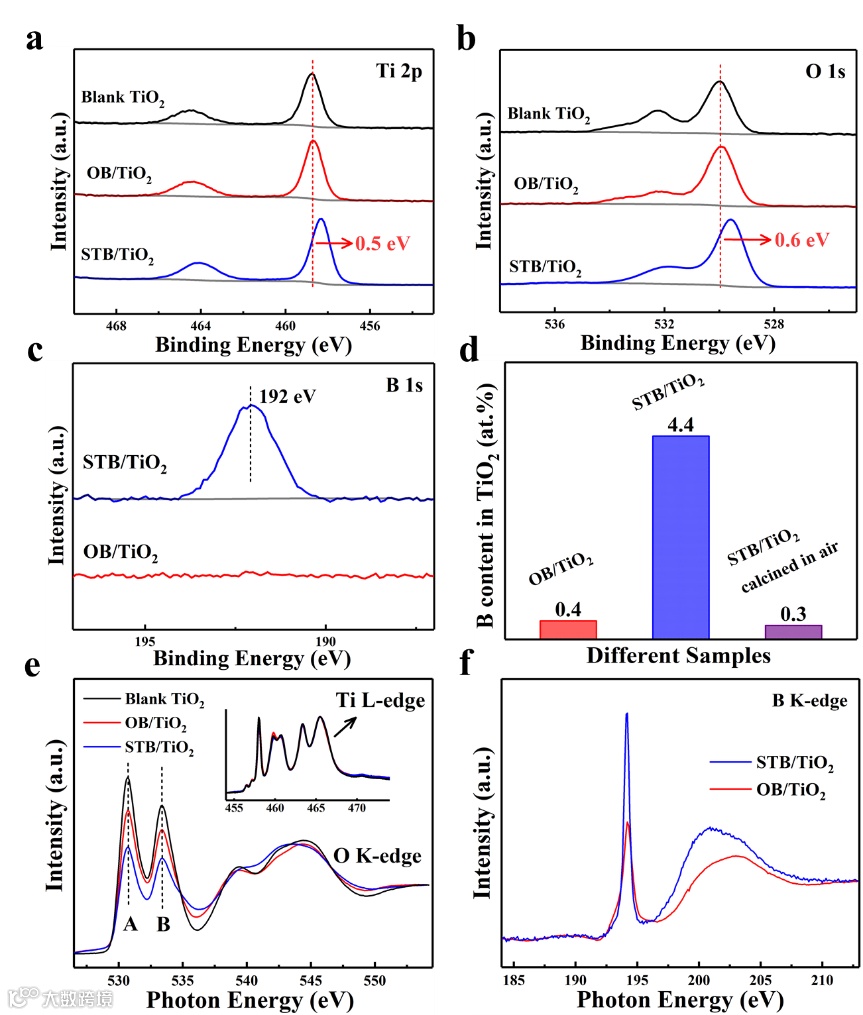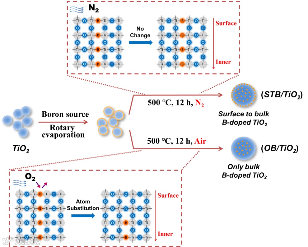 通过控制煅烧气氛制备了STB/TiO2和OB/TiO2两种样品。由于B对晶格O的取代与N2分子无关,因此可以实现B从表面晶格O向内部体相晶格O的深度取代,最终生成STB/TiO2。然而,当气氛变为空气时,O原子在B掺杂位上会发生二次取代,由于表面稳定的TiO2层的保护,深层的即体相的B掺杂位点不会受到影响,最终得到OB/TiO2。
