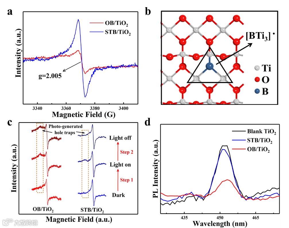 原位光协助低温EPR实验证实光生空穴捕获位点(Ti4+O2-Ti4+O•-)的存在,并发现其容易被表面大量的B掺杂位点所淬灭。这会使得光生空穴更自由地转移,也更易于和表面上的电子发生复合作用。表面B掺杂位点对TiO2可见光催化制氢活性表现了抑制作用。