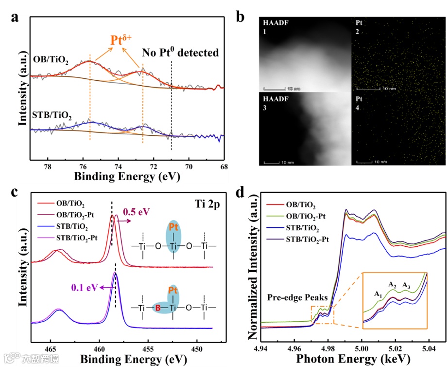 多种表征数据进一步揭示了Pt沉积后OB/TiO2和STB/TiO2表面的变化,观察到一种基于强金属-载体相互作用(SMSI)效应的Pt-Ti沉积位点。当表面有B取代时会诱导Pt发生定向沉积,形成特殊的B-Ti-Pt结构。这种特殊结构会抑制光生电子向Pt位点的转移,同时为光生载流子的复合重组提供平台。这符合Shockley-Read-Hall(SRH)复合模型,使得光生电子在界面处的快速迁移动力学受到严重抑制。