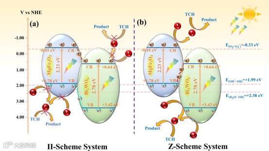 图4. MFO/BWO异质结光催化剂的光激发载流子转移示意图。(a)Ⅱ型光催化机制,(b)Z光催化机制。